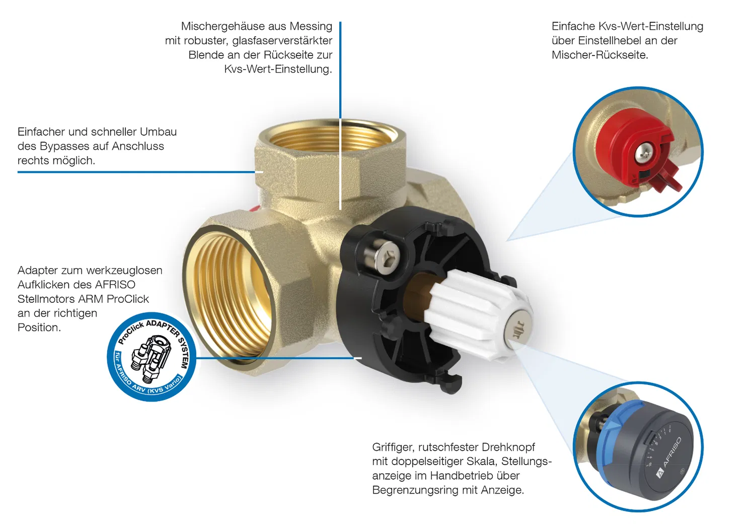 Das Ventil verfügt über ein robustes Messinggehäuse und eine Handbetätigung mit Skala (0–10 bzw. 10–0). Der Drehwinkel von 90° ermöglicht eine exakte Steuerung. Mit dem ProClick-Adapter lassen sich Afriso ARM-Stellmotoren schnell und einfach montieren.