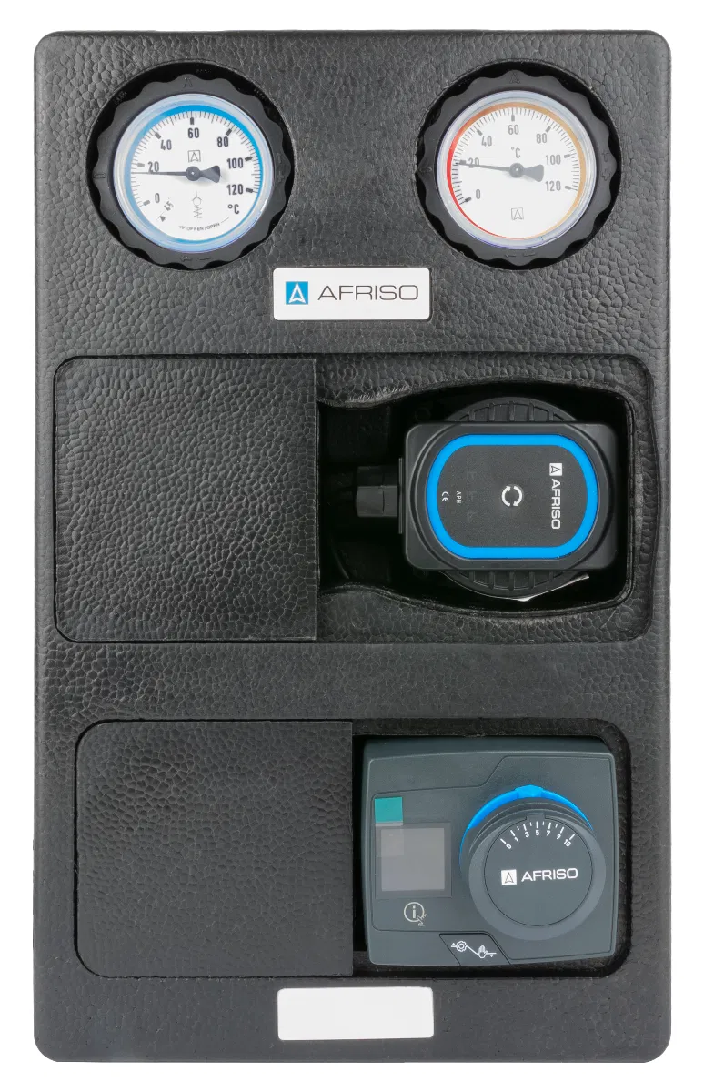 Der Vorlauf lässt sich auf Wunsch rechts oder links umbauen. Die inklusive Afriso Hocheffizienzpumpe arbeitet mit Energieeffizienzklasse A und einer Förderhöhe von 7 m.