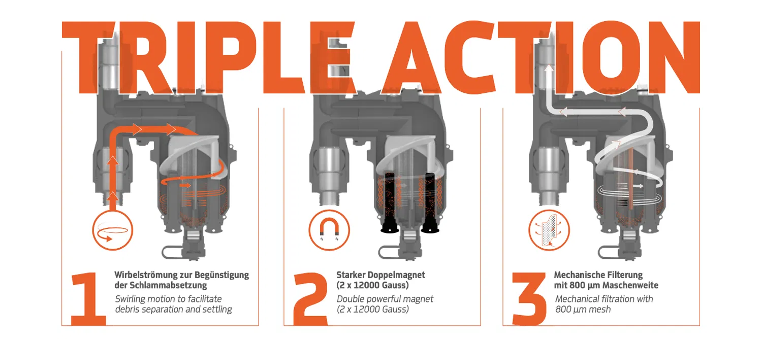Dreifache Filterwirkung: Wirbelstrom-Vorabscheidung, Doppelmagnet (2 x 12 000 Gauß) und Maschenfilter