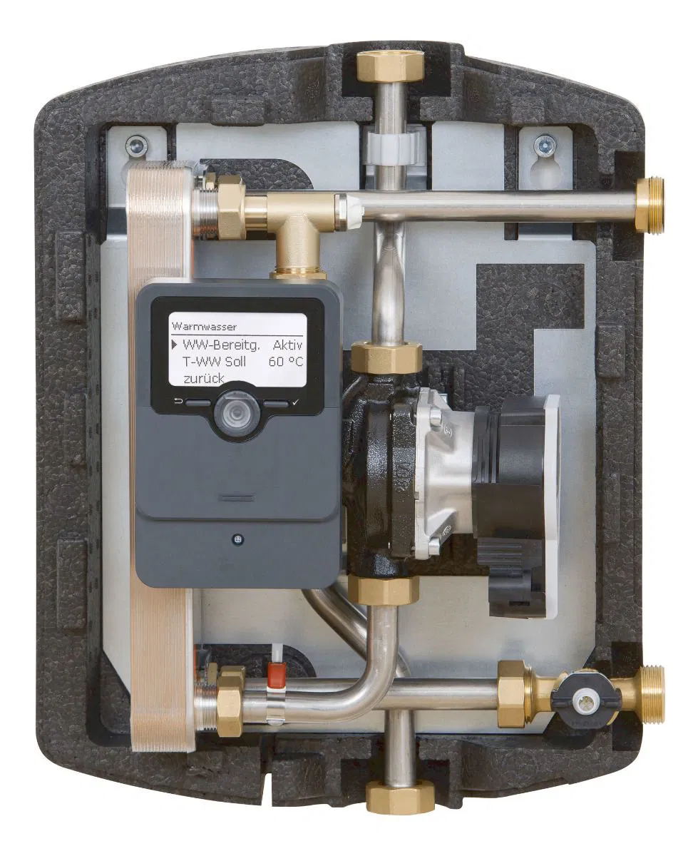 Herzstück der Station ist ein gelöteter Edelstahl-Plattenwärmetauscher mit 30 Platten, der eine effiziente und hygienische Wärmeübertragung gewährleistet. Dank des Resol-Reglers mit übersichtlichem Display lassen sich Warmwassertemperatur sowie Zirkulationsprogramme komfortabel einstellen und überwachen.