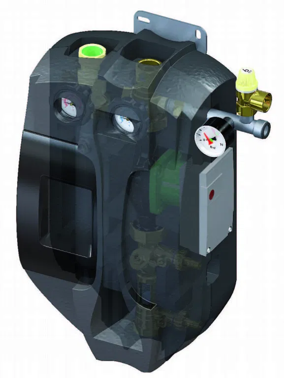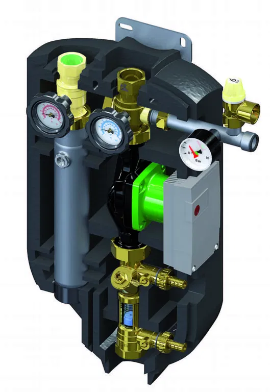 Die MAVERICK VRD-90 ist für Wandmontage oder Speichereinbau ausgelegt. Die seitliche Öffnung der Umwälzpumpe gewährleistet eine optimale Belüftung, und die geflanschten Kugelhähne mit integrierten Thermometern erleichtern die Überwachung der Systemtemperaturen. Die hochwertige Wärmedämmung aus schwarzem EPP (40 g/l) reduziert Wärmeverluste und sorgt für maximale Energieeffizienz.