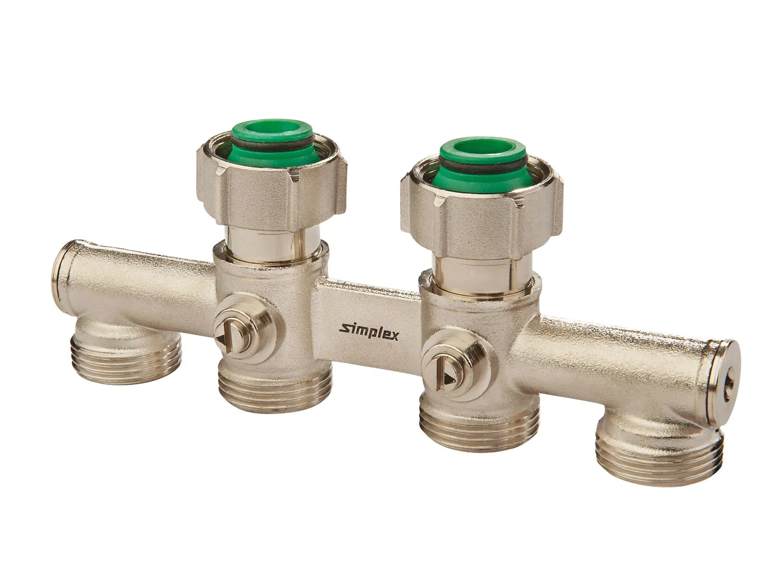 Der Simplex 4-fach Hahnblock ist die perfekte Lösung für Ventil-Kompaktheizkörper mit 3/4″ Außengewinde (Eurokonus). Mit 4 Anschlüssen, integriertem 3-Wege-Kugelventil und Absperrfunktion ermöglicht er flexible Steuerung und einfache Montage.