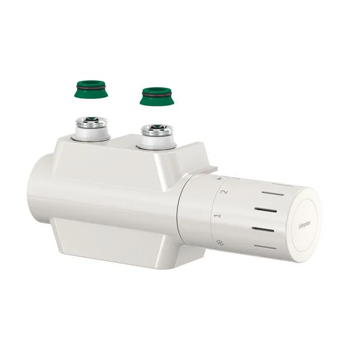 Der Simplex Variodesign Ventilhahnblock in Weiß ist ein kombinierter Hahnblock mit Thermostatventil und eleganter Designabdeckung, speziell entwickelt für Bad-, Handtuch- und Designheizkörper. Er verbindet funktionale Technik mit einer modernen, dezenten Optik.