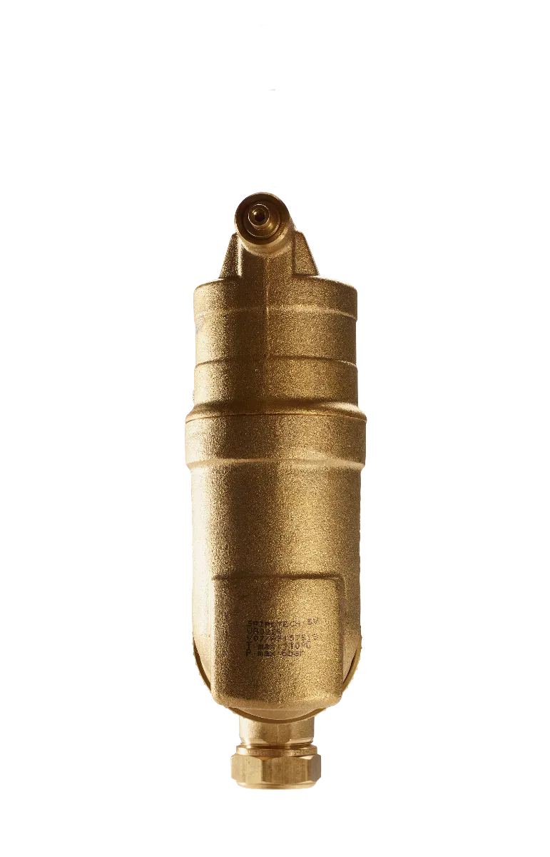 Der Mikroluftblasenabscheider ist für die Medien Wasser und Wasser/Glykol (50/50%) geeignet. Das robuste Messinggehäuse garantiert Langlebigkeit und zuverlässigen Betrieb. Die Entgasung erfolgt über den Spirorohreinsatz bis auf einen Restluftanteil von nur 0,4 %, während das permanente Entlüftungsventil für eine kontinuierliche Luftabfuhr sorgt.