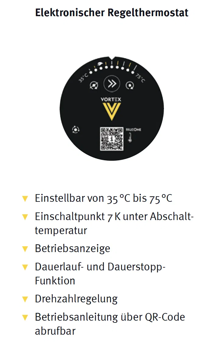 BlueOne Brauchwasserpumpe inklusive elektronischem Regelthermostat. Einstellbar von 35° bis 75 °C, Einschaltpunkt 7K unter Abschalttemperatur. Betriebsanzeige. 1/2″ Außengewinde. Rückschlagventil und Kugelabsperrhahn sind im Pumpengehäuse eingebaut. „