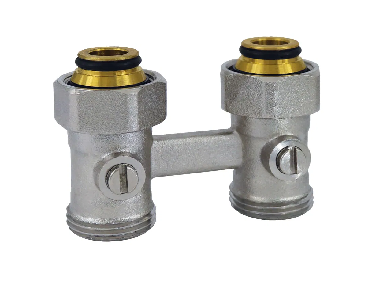 Der Zweirohr-Hahnblock Eurokonus Durchgang 3/4″ AG × 3/4″ Überwurfmutter bietet flexible, zuverlässige Anschlussmöglichkeiten für moderne Heizkörper in Zweirohrsystemen.
